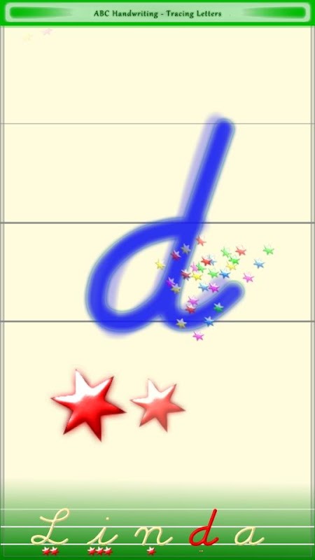 আবেদন রঙিন এবং ইউজার ইন্টারফেস পড়া সহজ হয়েছে. খেলা অঙ্কন মাধ্যমে এটা শুরু থেকে সঠিক অক্ষর গঠন নিদর্শন শিখতে সাহায্য করে এবং উন্নতি নক্ষত্র দ্বারা পুরস্কৃত করা হয়.