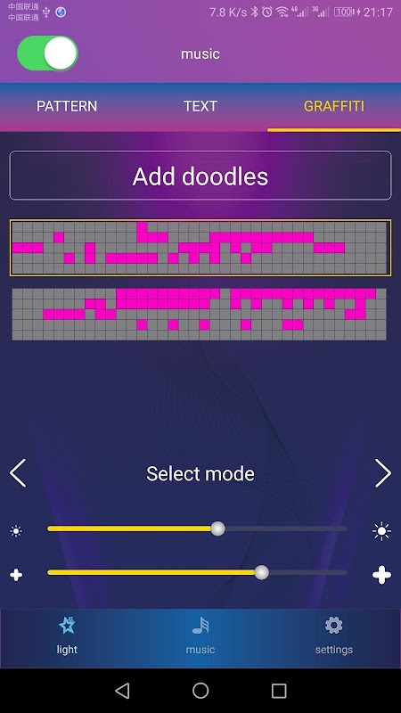 After selecting the connection, through the application, searching for local music, selecting to play, you can read the music playing rhythm and control the color change of the lamp;Support mode control, Supports control based on the sound rhythm collected by the microphone;