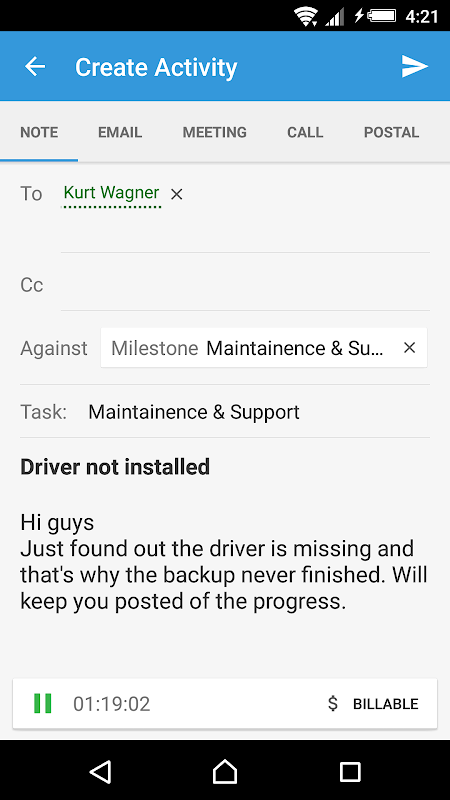 - ক্রিয়াকলাপের মাধ্যমে সহজেই বিলযোগ্য এবং অ-বিলযোগ্য সময় লগ করুন;