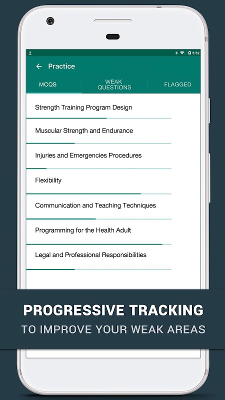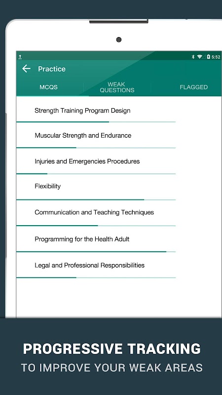 The app's exclusive features offer offline functionality on the go. This app comes with a highly progressive tracking system designed by ACE personal trainer practice test experts. The threefold features of this system involve a targeted progress bar displaying the headway of the user, a weak question features dedicated to improving weak ACE personal trainer exam questions and lastly a bookmarking feature for the users to pin questions. Other tutoring features include daily study reminders, easy to use interface, customized themes and many more.
