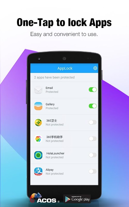 ACOS AppLock is a simple and practical application, allowing you protect your SMS, Contacts, gallery and sensitive Apps from prying eyes.