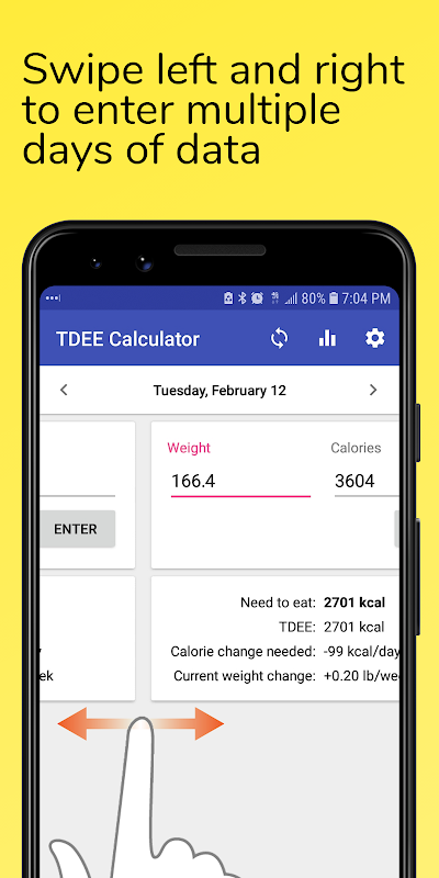 নিয়মিত আপনার শরীরের ওজন এবং ক্যালোরি গ্রহণ করুন। অ্যাপটি কিছু গণিত করবে, এবং তারপর হিসাব করবে আপনার শরীর প্রতিদিন কত ক্যালোরি ব্যবহার করে! আপনি যত বেশি ডেটা প্রবেশ করবেন, গণনা তত বেশি সঠিক হবে।
