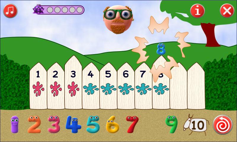 A Numberjack is trapped in the Puzzler’s bubble. Choose numbers that add up to the trapped Numberjack. Count the splats to work out how many more are needed. Burst the bubble to set the Numberjack free.