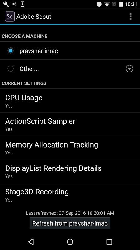 The Adobe® Scout mobile app is for developers using Scout, the new profiler and analysis tool from Adobe. Install Scout on your desktop, then run this app to profile your Android apps.