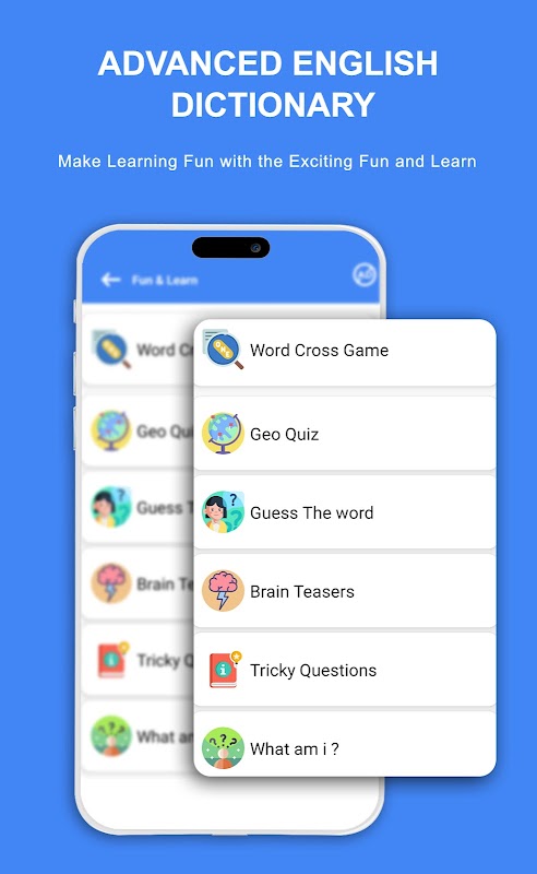 এই অ্যাপটিতে আরও উন্নত বৈশিষ্ট্য রয়েছে যেমন দিনের কুইজ, বানান পরামর্শ, উন্নত শিক্ষার্থীর শব্দভাণ্ডার, কথা বলুন এবং অনুবাদ করুন, সমস্ত ভাষা অনুবাদক, ক্যামেরা অনুবাদক, অনুসন্ধান করা শব্দের ইতিহাস এবং সংরক্ষিত প্রিয় শব্দ।