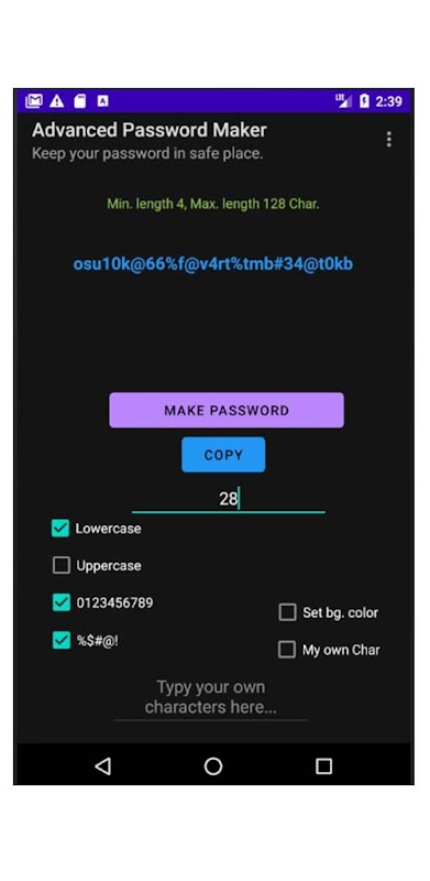 With this application user can generate random password, long or short password, Uppercase/Lowercase/Numbers/Symbols.