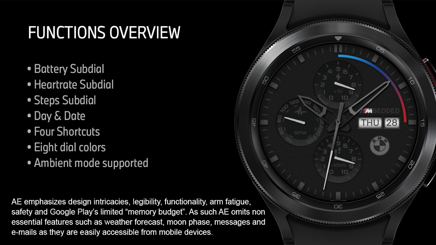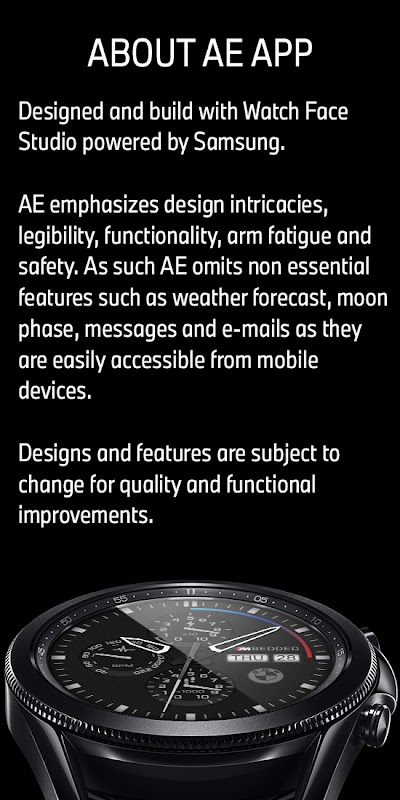 AE অ্যাপগুলি সেকেন্ডারি মাস্কিং ছাড়াই 30+ এর API সহ Samsung দ্বারা চালিত ওয়াচ ফেস স্টুডিও দিয়ে তৈরি করা হয়েছে এবং তাই এটি প্রায় 13,800টি অ্যান্ড্রয়েড ডিভাইসের (ফোন) মাধ্যমে প্লে স্টোরে খুঁজে পাওয়া যাবে না। যদি আপনার ডিভাইস (ফোন) অনুরোধ করে "এই অ্যাপটি আপনার ডিভাইসের (ফোন) সাথে সামঞ্জস্যপূর্ণ নয়", তাহলে প্রস্থান করুন এবং আবার চেষ্টা করুন বা ব্রাউজ করুন এবং আপনার ব্যক্তিগত কম্পিউটারে ওয়েব ব্রাউজার থেকে ডাউনলোড করুন।