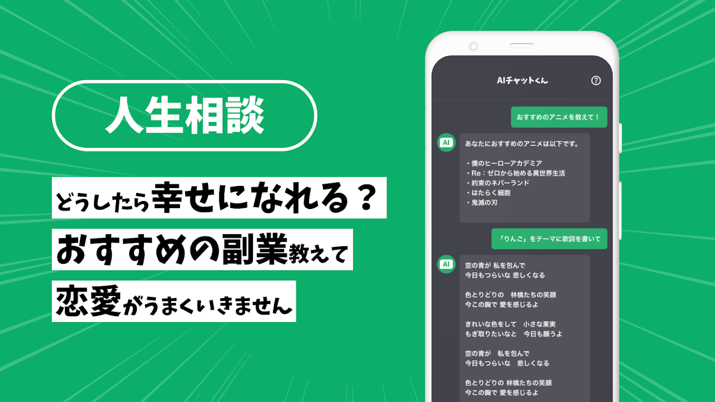 অনেক টিভি উপস্থিতি! একটি AI চ্যাট অ্যাপ যা 3 মিলিয়নেরও বেশি নিবন্ধন সহ জাপানি ভাষায় ব্যবহার করা যেতে পারে। উদ্বেগ এবং ভালবাসা সম্পর্কে পরামর্শ থেকে কাজের দক্ষতা উন্নত করা। OpenAI এর চ্যাট GPT ব্যবহার করে।