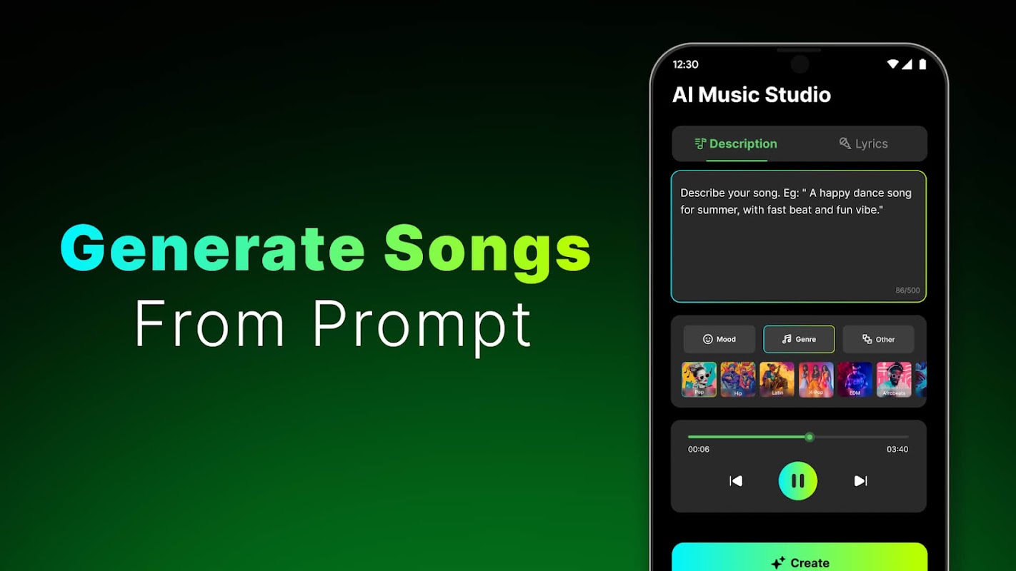 - আপনার সৃষ্টির ধরন চয়ন করুন: কণ্ঠ দিয়ে সম্পূর্ণ গান তৈরি করুন বা বিশুদ্ধ যন্ত্রসঙ্গীতের পরিবেশে নিজেকে নিমজ্জিত করুন।