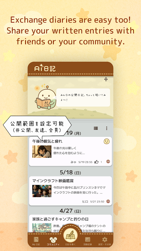 অন্যান্য ব্যবহারকারীর ডায়েরি পড়া নতুন আবিষ্কার এবং শেখার দিকে পরিচালিত করতে পারে। সমমনা ব্যক্তিদের সাথে দেখা করুন যার সাথে আপনি সহানুভূতিশীল হতে পারেন এবং আপনার দৈনন্দিন জীবনকে সমৃদ্ধ করতে পারেন৷