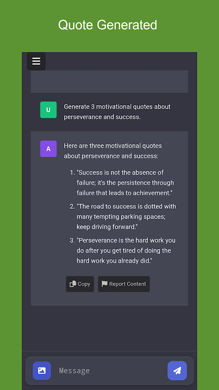 বিষয়বস্তু নির্মাতা, সোশ্যাল মিডিয়া উত্সাহী, লেখক বা অর্থপূর্ণ শব্দ শেয়ার করতে চান এমন যেকোন ব্যক্তির জন্য উপযুক্ত, এআই কোট জেনারেটর আকর্ষক এবং স্মরণীয় উদ্ধৃতি তৈরি করার প্রক্রিয়াটিকে সহজ করে। উন্নত AI দ্বারা চালিত, এই অ্যাপটি নিশ্চিত করে যে আপনার উদ্ধৃতিগুলি শুধুমাত্র আসল নয় কিন্তু প্রভাবশালীও।