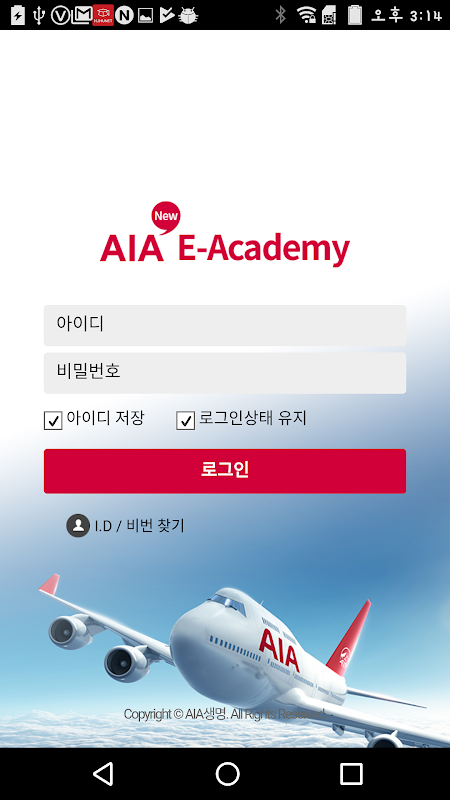 PC환경의 AIA New E-Academy(http://aiatsd.hunet.co.kr)의 아이디와 비밀번호로 로그인 가능하며, 주요 서비스를 본 모바일 앱에서도 사용하실 수 있습니다.