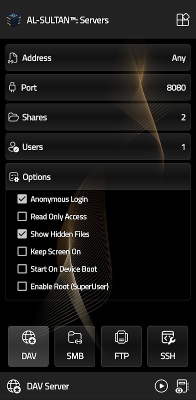 সার্ভার হল একটি দ্রুত এবং নিরাপদ অ্যাপ্লিকেশন যা সর্বাধিক ব্যবহৃত সার্ভার প্রদান করে: FTP সার্ভার, SMB সার্ভার v3, WebDav সার্ভার এবং SSH সার্ভার