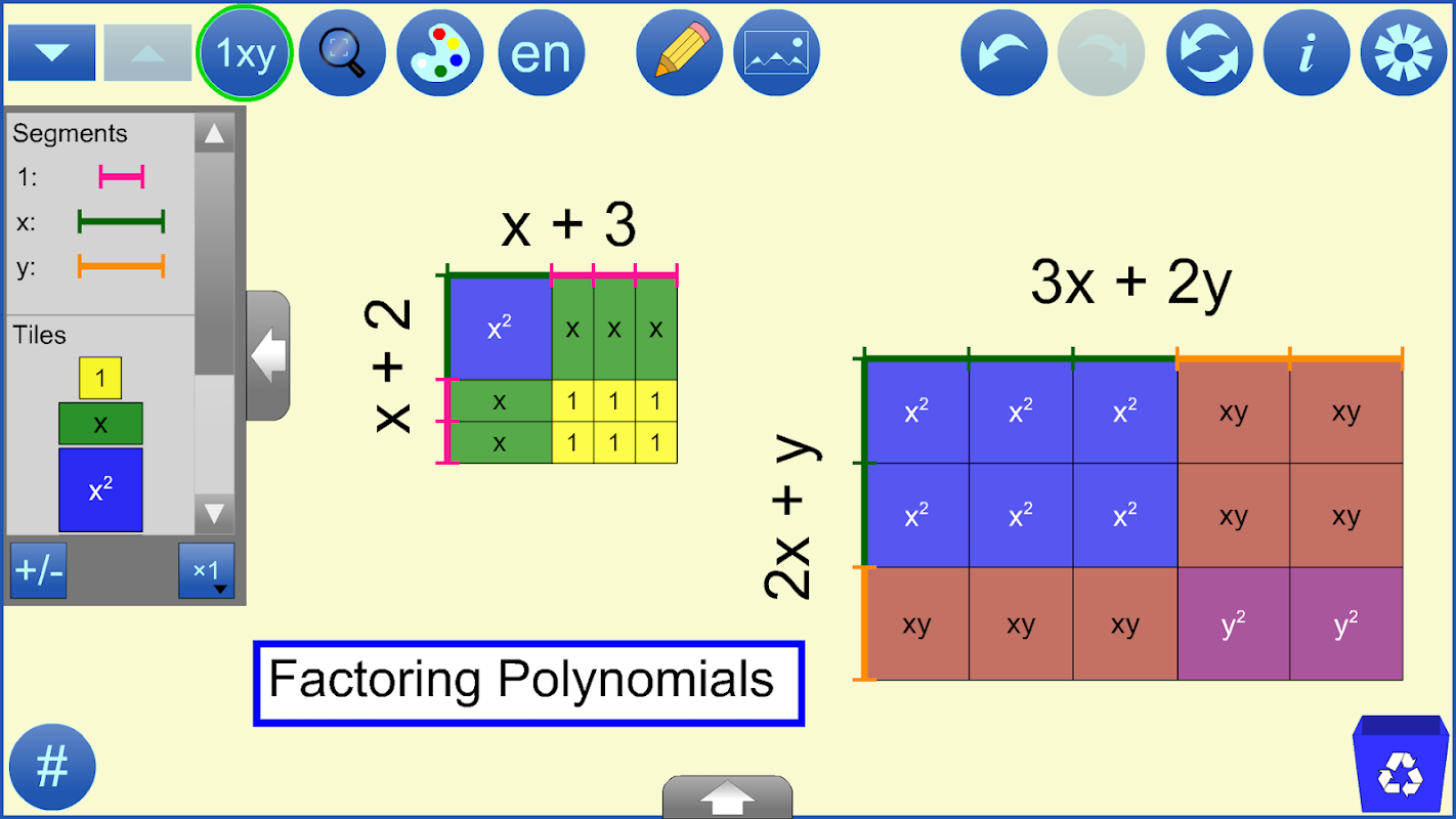 ভিসুয়াল উপস্থাপনাগুলি গাণিতিক ধারণার বিকাশ ও প্রয়োগের ক্ষেত্রে ছাত্রদের সহায়তা করে। বীজগণিত টাইল ব্যবহার করতে পারেন: