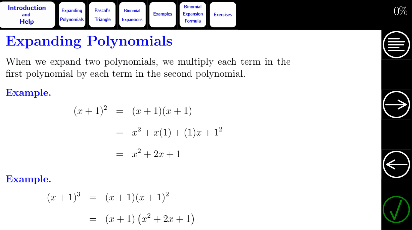 * Studying mathematics is best done by working through examples and exercises. There are many interactive examples and exercises in this tutorial that must be completed to achieve 100% progress.