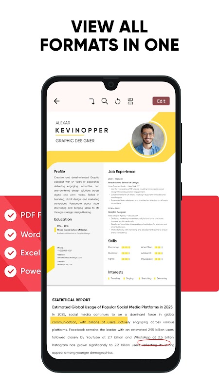 সমস্ত ডকুমেন্ট রিডার এবং এডিটর আপনাকে আপনার ফোনের সমস্ত প্রধান ফাইল ফর্ম্যাট এক জায়গায় খুলতে এবং পরিচালনা করতে সহায়তা করে।