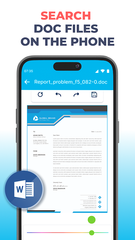 ডক্স ভিউয়ার এবং ফাইল ওপেনার Microsoft Office পণ্য যেমন Word, Excel, PowerPoint এবং অন্যান্য থেকে নথির সাথে কাজ করে। অ্যাপ্লিকেশনটির সাথে কাজ করে, ব্যবহারকারীরা মোবাইল ডিভাইসের অভ্যন্তরীণ মেমরি বা সংযুক্ত এসডি কার্ডে অবস্থিত ফাইলগুলি খোলার সুযোগ পান। উপরন্তু, আপনি ইন্টারনেট থেকে ডাউনলোড করা ফাইল ও সেইসাথে ই-মেইলের মাধ্যমে সংযুক্তি হিসেবে পাঠানো ফাইল খুলতে পারেন।