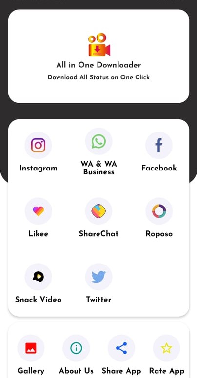 By using the All In One Status Downloader you will be very easy to save your status in the gallery with one click from various social media such as Whatsapp, Facebook, Instagram, Twitter, Snack Video, Likee, Roposo, ShareChat.