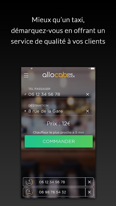 আরো দৌড় আপনি আপনার গ্রাহকদের জন্য বুক, আরো আপনি উপার্জন! প্রতিটি স্ট্রোক সঞ্চালিত, আপনি € 5 পাবেন। এই পরিষেবাটি রেস্টুরেন্ট এবং হোটেল শিল্পে সব পেশাদারদের জন্য একটি বাস্তব অতিরিক্ত আয় হয়। এই সার্ভিসটির সাহায্যে chr প্রতিষ্ঠানে সম্মুখীন শক্তিশালী চাহিদা মেটাতে এবং সন্তুষ্ট এবং গ্রাহকদের ধরে রাখা করার অনুমতি দেবে। খাবার যখন আপনার গ্রাহকদের প্রস্থানের উপর শেষে, তাদের উপর প্রয়োগ ওয়ান ক্লিক তাদের জন্য বুক করতে আপনার একাউন্ট থেকে Allocab চালক অফার। সেকেন্ড এটা বুক মধ্যেই গ্রাহকদের জাতি সরাসরি বোর্ডে চালক থেকে পরিশোধ এবং আপনি তাদের একটি নিরাপদ পরিবহন এবং মান মানে অফার। দ্রুত এবং ব্যবহার করার জন্য, আপনি পরিষেবার মান লাভ হবে সহজ, আপনি আপনার গ্রাহকদের জন্য আপনার অফারটি সম্পন্ন করব এবং আপনি সহজেই আপনার আয় বৃদ্ধি।