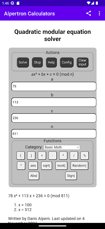 এই অ্যাপটি 10টি খুব দ্রুত ক্যালকুলেটর অফার করে: বিচ্ছিন্ন লগারিদম, ফ্যাক্টরিং ইন্টিজার, ফ্যাক্টরিং এবং পূর্ণসংখ্যা বহুপদীর মূল, পূর্ণসংখ্যার দ্বিঘাত সমীকরণ, মডুলার চতুর্ভুজ সমীকরণ, চারটি বর্গক্ষেত্রের সমষ্টি, চারটি ঘনক্ষেত্রের সমষ্টি, দুইটি বর্গক্ষেত্রের সমষ্টি, এবং শক্তির সমষ্টি। ভগ্নাংশ।