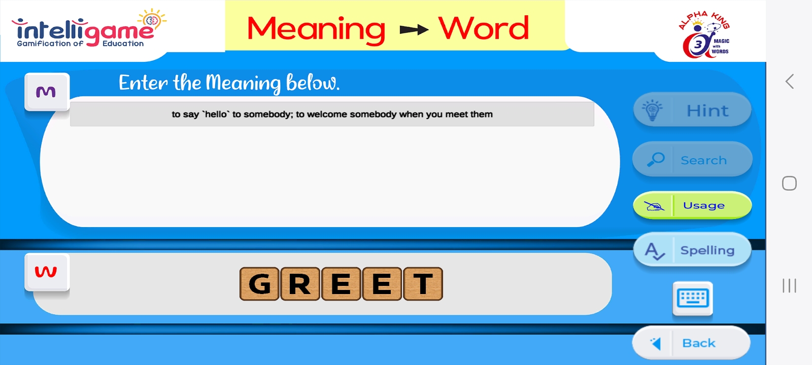 আলফা কিং 3 অ্যাপ ব্যবহারকারীকে অর্থ প্রদান করা হলে কেবল শব্দগুলি আবিষ্কার করতে সহায়তা করে না, এটি প্রদত্ত বর্ণমালার পছন্দ থেকেও শব্দ তৈরি করতে পারে।