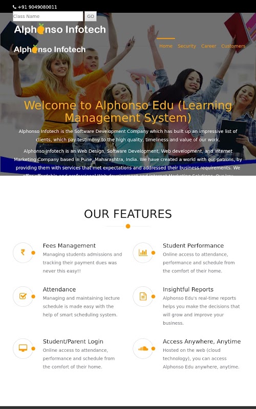 Alphonso Infotech is an Web Design, Software Development, Web development, and Internet Marketing Company based in Pune, Maharashtra, India. We have created a world with our patrons, by providing them with services that met expectations and addressed their business requirements. We offer affordable and professional Web development and Internet Marketing Solutions. Our key strengths are organization, effective planning and an emphasis on customer care. We strive to keep up to date with the latest technologies whilst trying to set new standards in the industry.