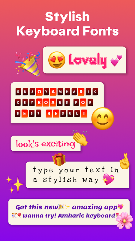 আমহারিক কীবোর্ড ইথিওপিয়া ব্যবহারকারীদের ব্যক্তিগতকৃত ইমোজি এবং স্টিকারের নতুন এবং ভিন্ন অভিব্যক্তিপূর্ণ ফাংশন আনার লক্ষ্য রাখে। আমাহারিকেবোর্ড সাংস্কৃতিকভাবে প্রাসঙ্গিক ইমোজি, কৌতুকপূর্ণ এবং অভিব্যক্তিপূর্ণ আইকন এবং চ্যাট বর্ধক প্রতীকগুলিতে নিজেকে গর্বিত করে।
