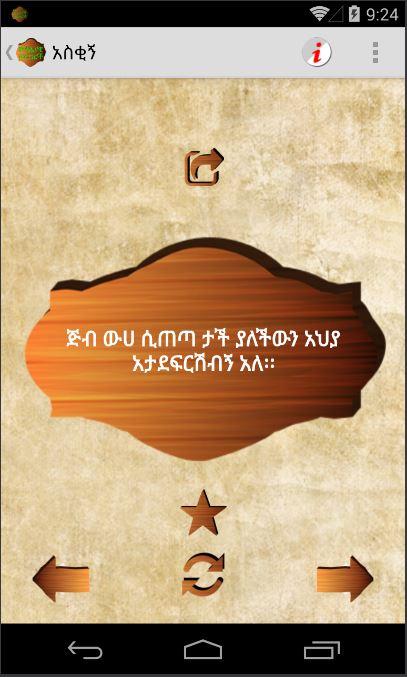হিতোপদেশগুলি তাদের প্রতিফলিত থিমের ভিত্তিতে শ্রেণিবদ্ধ করা হয় ... ውዴታና ፍቅር, ሀብታም ሀብታም ደሃ, እዉነትና እዉነትና, አስገራሚ, ተስፋ ና ፀፀት, ፍርሃትና ቆራጥነት, ክፋት ና ደግነት, ሀራምባና ቆቦ ቆቦ, ስራ, አሽሙር, አስቂኝ, ነገርና ነገርና ... ... আমহারিক প্রবাদের কয়েকটি বই আছে, কিন্তু পাঠকের পক্ষে সেগুলি পড়া বেশ চ্যালেঞ্জিং কারণ তারা কেবলমাত্র বর্ণমালায় প্রবাদগুলি লিখে রেখেছে। অ্যাপটি অনন্য এবং বিশেষ কারণ এটি আমহারিক প্রবাদ পড়াকে আরও সহজ এবং আকর্ষক করে তোলে।