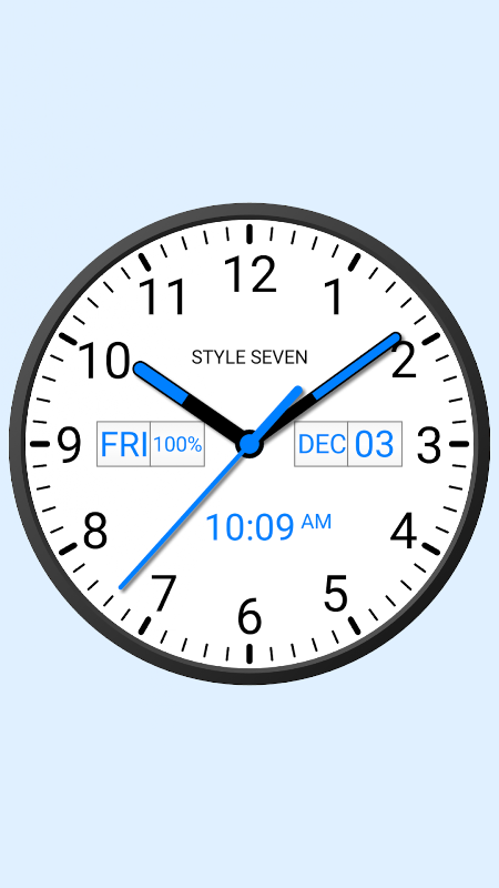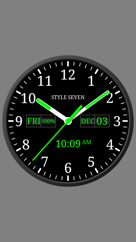 বর্তমান সময় প্রদর্শনের জন্য আসল আলো এবং অন্ধকার অ্যানালগ ঘড়ি। ঘড়িটি বর্তমান তারিখ, সপ্তাহের দিন, মাস এবং ব্যাটারি চার্জও প্রদর্শন করে (অ্যাপ উইজেট ব্যতীত)।
