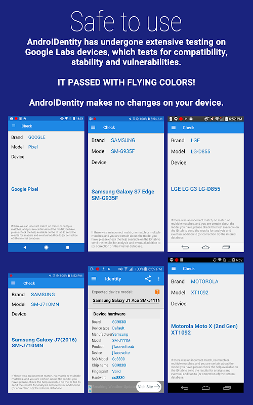 AndroIDentity ডিভাইসের হার্ডওয়্যার স্বাক্ষর পড়ে এবং 15.950 পরিচিত ডিভাইস স্বাক্ষর অভ্যন্তরীণ ডাটাবেসের সঙ্গে মিলিয়ে করার চেষ্টা করে, এবং Google এর নিজস্ব ডিভাইস ডেটাবেসের একটি উন্নত এবং সংকলিত সংস্করণ। তখনই বলব আপনার ডিভাইসের বাস্তব ব্র্যান্ড এবং মডেল প্লাস অন্যান্য দরকারী তথ্য অনেক কি।