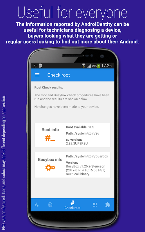 AndroIDentity এছাড়াও "su কমান্ড" বাইনারি উপস্থিতি, যা নির্দেশ করে আপনার ফোন মূলী হয় পরীক্ষা করতে পারেন। এই বৈশিষ্ট্যটি শুধু একটি কল্পনানুসারে নতুন ফোন কেনার তাদের জন্য এর, রুট পরীক্ষা তাদের জন্য উপকারে আসে: একটি নতুন ফোন রুট বা "su কমান্ড" উপস্থিতিতে ইঙ্গিত করে, এটি ছিল এটা ফার্মওয়্যার বা নষ্ট বুট-লোডার আছে।