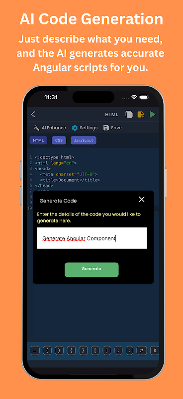 বিল্ট-ইন অ্যাঙ্গুলার কোড এডিটর: অ্যাপে সরাসরি কৌণিক কোড লিখুন, সম্পাদনা করুন এবং পূর্বরূপ দেখুন। কোনো সেটআপের প্রয়োজন নেই—শুধুমাত্র সম্পাদক চালু করুন এবং আপনি বাস্তব সময়ে উপাদান, পরিষেবা, নির্দেশিকা এবং আরও অনেক কিছু তৈরি করতে প্রস্তুত৷