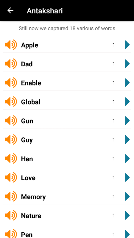 এই অ্যাপ টি শুধুমাত্র পার্থক্য হল যে আমরা পরিবর্তে গান শব্দ ব্যবহার হয় গাওয়া খেলা 'Antakshari' থেকে অনুরূপ। খেলা একটি শব্দ যে অ্যাপ দ্বারা উৎপন্ন হয় সঙ্গে শুরু হয়। পরবর্তী শব্দের অংশগ্রহণকারী ধরনের, কিন্তু শব্দ অ্যাপ্লিকেশন দ্বারা তৈরি শব্দের গত বর্ণমালা দিয়ে শুরু করতে হবে। অ্যাপ্লিকেশন তারপর পরবর্তী শব্দের উত্পন্ন করবে (যা খেলোয়াড়ের শব্দের গত বর্ণমালা দিয়ে শুরু হয়)। অ্যাপটি যে কোনো শব্দ যে ইতিমধ্যেই ব্যবহার করা হয়েছে প্রত্যাখ্যান করবে।