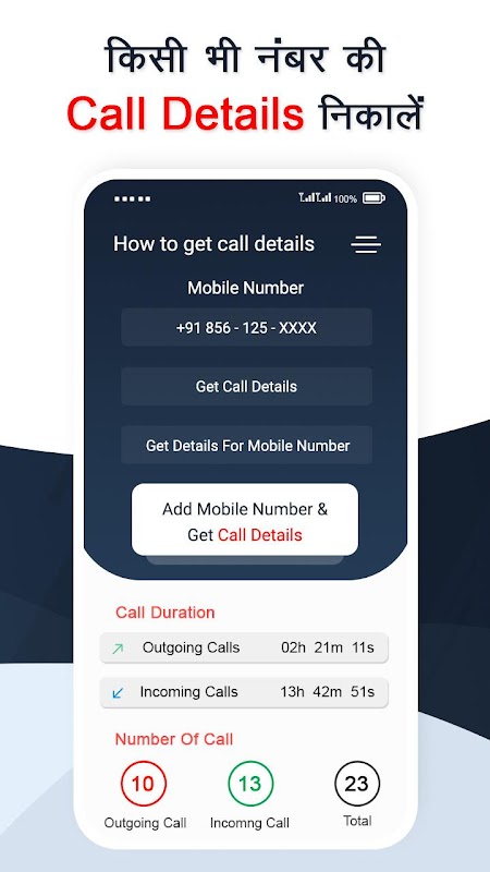 Any Number Call Detail – Call History keep up to past 1000 days call logs and list them category wise for ease of access. Quick and advanced search options help you to easily access data you are looking for. There are many other features included to manage your call logs easily and efficiently.