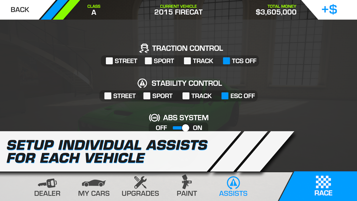 Race how you want to, with auto or manual shifting, and a full suite of electronic aides to assist you. Street, Sport, Race and OFF are modes available for Traction Control (TCS) and Electronic Stability Control (ESC). You can set up the assists for each individual vehicle to race the way you like. No more changing settings when you switch cars.