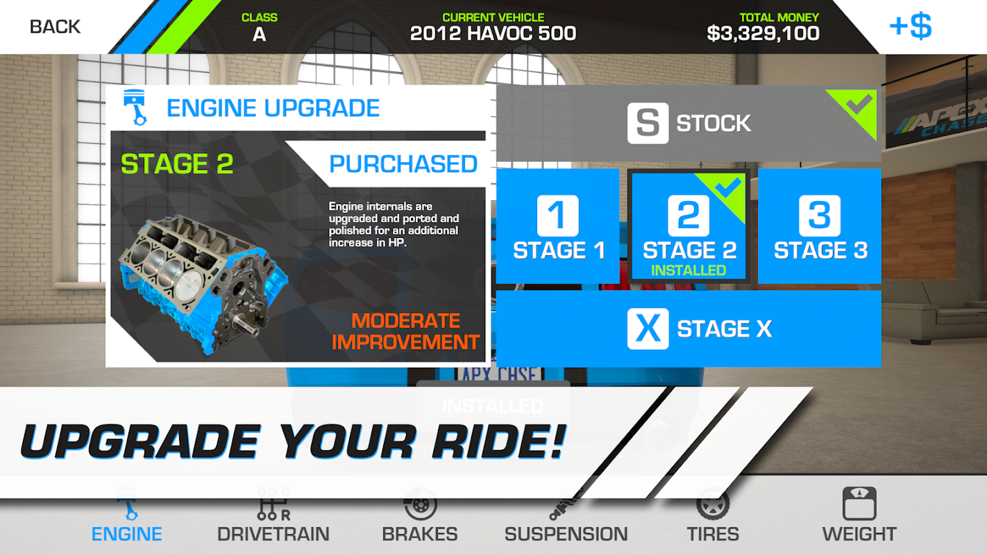 Engines, drivetrain, brakes, suspension, tires and weight can all be upgraded from stock, to stage1 - stage3. Each vehicle has a special stage X engine upgrade which add massive power to the vehicle, maybe more than it can handle... Are you up for it?