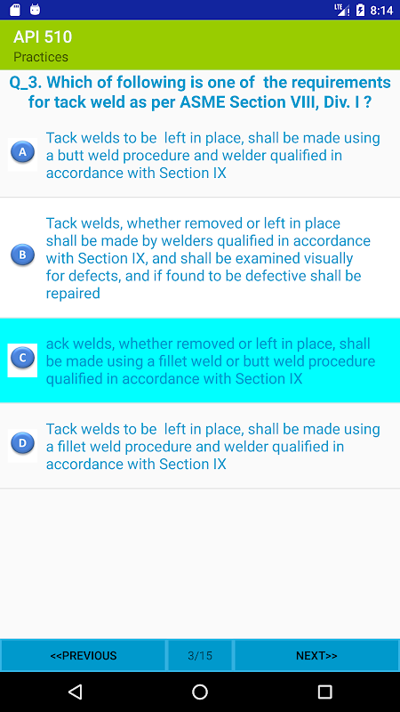 This Free version only has 15 practices and 10 exams questions to show you the general view of the app. The Full Exams version includes more than 1000 questions that cover the whole sections of API 510 Test