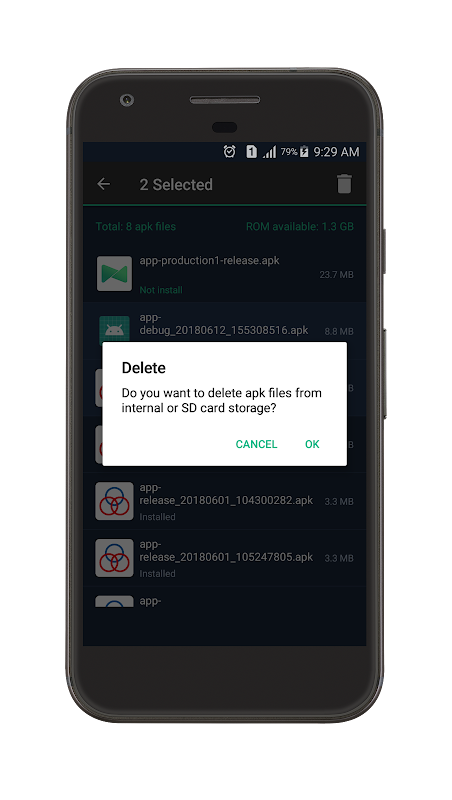 - Delete apk files from internal, sdcard storage.