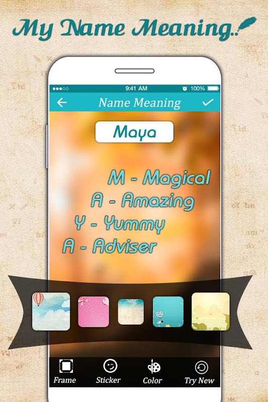 My Name meaning Application help you to check what is behind your name and make a picture with your name meaning.The information in your name can reveal your destiny.