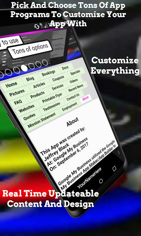 We are an App Builder whom made you an App Maker, embedding Tools to empower your Business with control over your App. This App Maker allows you to change the content in your App even after it is Published. If your prices change or other things change like you make a new Flyer, Document, Picture, Video ect. with the services of this App Builder you can update your Business App right from your phone even while out in the field and the changes go live immediately across all your customers' devices.