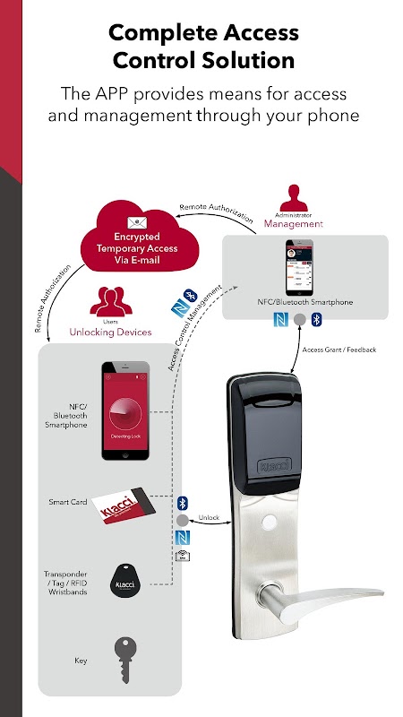 প্রশাসক ফোন ব্যবহারকারীর ফোন, স্মার্ট কার্ড বা ট্রান্সপন্ডারস অ্যাক্সেসের মঞ্জুরি করতে NFC বা ব্লুটুথ ব্যবহার করতে পারেন। এছাড়া ব্লুটুথ প্রযুক্তি ব্যবহার করে লক মধ্যে নতুন অনুমোদন তথ্য লিখতে পারেন। ব্যবহারকারী তার ডিভাইসের একাধিক দরজা অ্যাক্সেস করতে পারেন। প্রতিটি অ্যাক্সেস একটি নিরীক্ষা লেজ ছেড়ে চলে যেতে হবে এবং একবার প্রশাসক লক সঙ্গে তাদের ডিভাইস সিঙ্ক করে প্রশাসক দ্বারা দেখা যাবে। যদি প্রশাসক একটি ব্যবহারকারী অ্যাক্সেসের মঞ্জুরি প্রয়োজন কিন্তু বর্তমান হতে পারে না, একটি এনক্রিপ্ট করা সাময়িক ভাবে অ্যাক্সেস কোড সহ একটি ই-মেইল ব্যবহারকারীর ই-মেইল অ্যাকাউন্টে পাঠানো যেতে পারে।