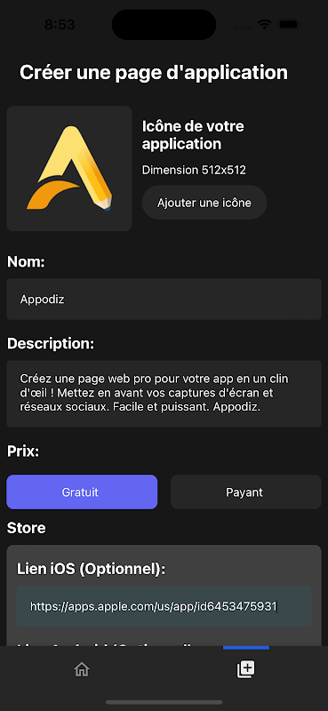 অ্যাপোডিজের সাথে আপনার মোবাইল অ্যাপ্লিকেশনের জন্য একটি পেশাদার ওয়েব পৃষ্ঠা তৈরি করুন! আপনার সবচেয়ে চিত্তাকর্ষক স্ক্রিনশটগুলি দেখান এবং কার্যকর প্রচারের জন্য নির্বিঘ্নে আপনার সামাজিক নেটওয়ার্কগুলিকে সংহত করুন৷ প্রয়োজনীয় আইনি তথ্য যেমন গোপনীয়তা নীতি এবং শর্তাবলী সরাসরি অ্যাক্সেস প্রদান করে স্বচ্ছতা নিশ্চিত করুন।
