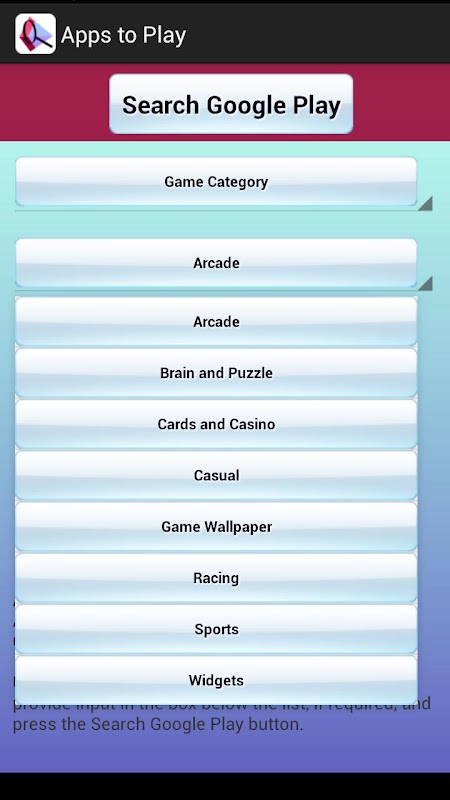 Search the Google Play Store for Android apps easily by App Classpath, App Category, Collections, Developer, Game Category, Keyword or go quickly to your apps.