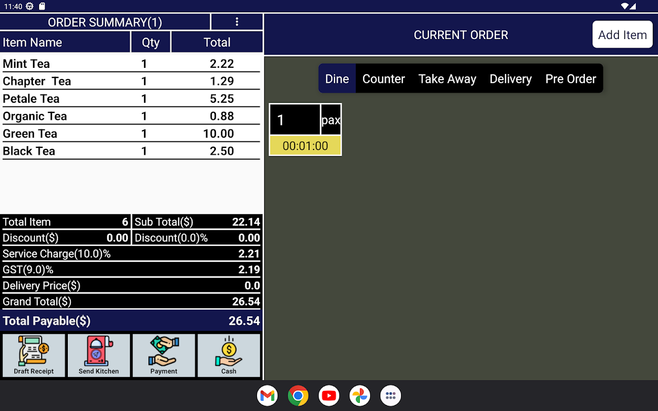 একবার লগ ইন করলে, ব্যবহারকারীদের প্রধান ড্যাশবোর্ডে নিয়ে যাওয়া হয়, যা নতুন অর্ডার, বর্তমান আদেশ, প্রতিবেদন, প্রিন্টার কনফিগারেশন, চালান ইতিহাস এবং আরও অনেক কিছুর মতো বিভিন্ন বৈশিষ্ট্য অফার করে। ব্যবহারকারীরা ডাইন-ইন, টেকওয়ে, ডেলিভারি বা প্রি-অর্ডারের মতো পরিষেবার ধরন বেছে নিতে পারেন।