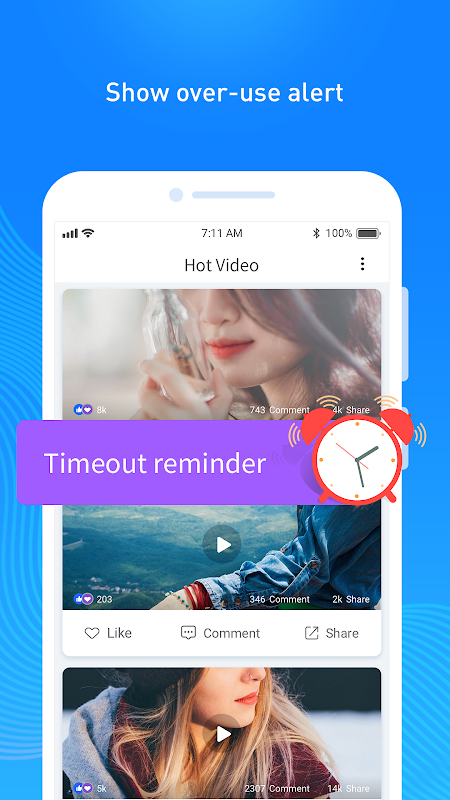 You can set a limit to the usage duration and frequency of each app. There will be an overuse reminder. Get your time back from social media apps and games!