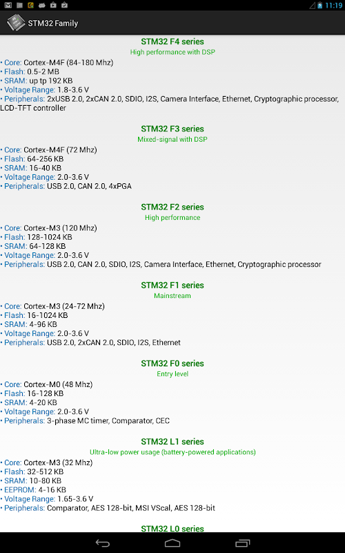 - STM32 microcontroller family description (tap "info icon" in the upper right corner),