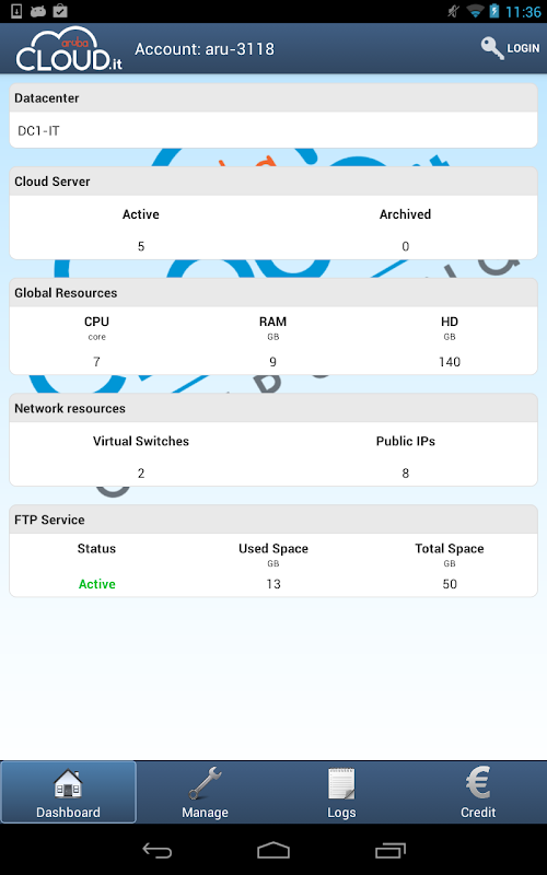 The application allows you to view the features of the virtual Data Centers, perform operations on the Cloud Servers and top-up your credit directly from your tablet, paying by PayPal or Credit Card.
