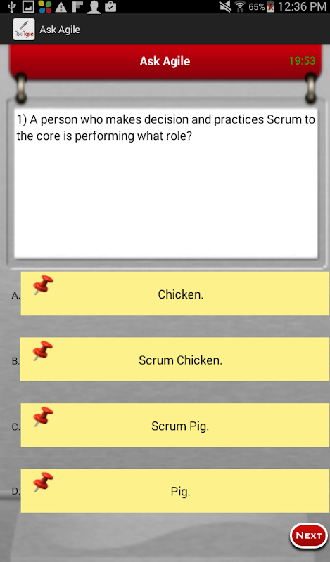 Ask Agile helps to improve your Agile skills by systematically walking you through effective practice questions with multiple choice answers. There is no limitation on the number of exams you can take. Each quiz will takes less than 20 minutes only. Ask Agile provides you an interactive way to learn Agile basics and to prepare for Agile certifications. With over 200 sample exam questions based on Agile fundamentals, tools and process Ask Agile take you one step closer to the ACP, Certified Agile Practitioner, Scrum Master exams.