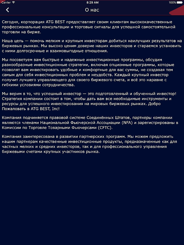 В этом приложении вы найдете всю необходимую для вас информацию по услугам корпорации ATG BEST, а так же видео и аудио презентации. Кроме этого, вам будет доступна возможность участвовать в игровой опции, где за пользование приложением, рекламу и продвижение услуг корпорации ATG BEST вам будут начисляться золотые монетки. Все заработанные монетки, которыми щедро одарит вас корпорация ATG BEST, вы сможете два раза в месяц превращать в настоящие доллары и выводить на свою банковскую карту.
