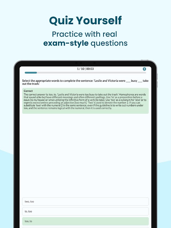 - প্রতিটি TEAS অনুশীলন প্রশ্নের জন্য বিশদ ব্যাখ্যা সহ তাত্ক্ষণিক প্রতিক্রিয়া